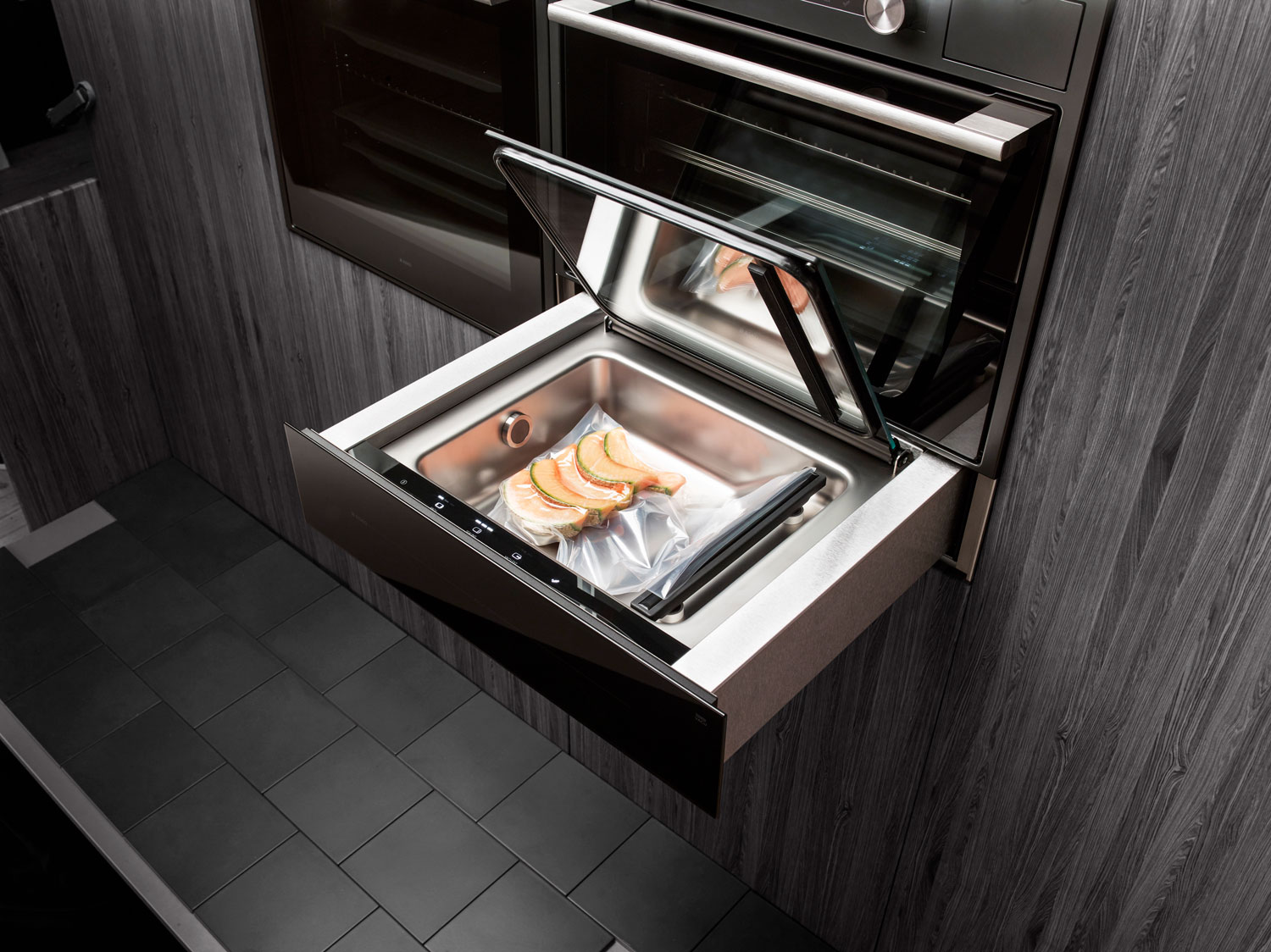 Вакууматор Asko ODV8127B станет незаменимым помощником на Вашей кухне. Устройство работает со стандартными пакетами 25×35 см, что делает эксплуатацию удобнее. Товар выполнен в цвете черная сталь, что подойдет к любой кухне и дополнит его интерьер. Управление осуществляется за счет сенсорной панели, которая находится за фронтальной частью. Благодаря этому она защищена от пыли и других воздействий. Интуитивно понятные кнопки делают навигацию простой и удобной. Выдвигается устройство на телескопических направляющих с фиксацией. Это помогает легко открывать и закрывать девайс. Открывается данная техника по принципу touch2Open. То есть необходимо нажать на фронтальную часть, тогда механизм сработает. Отсутствие ручек гарантируют безопасность данного процесса.