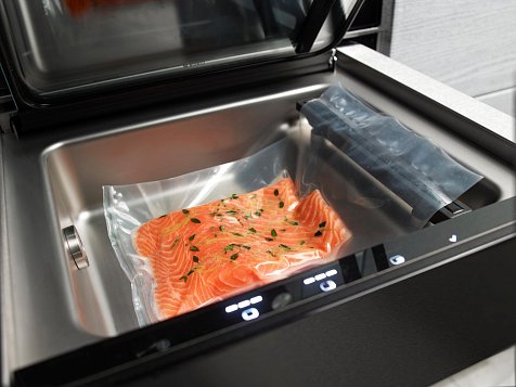 Вакууматор Аско ODV8127B можно запрограммировать на три уровня вакуума. Низкий используется для нежных продуктов вроде фруктов, ягод и хлеба. Средний — для жидкостей и мягкой пищи вроде супов и рыбы. А на высоком хранят твёрдые продукты вроде мяса, сыров, овощей и многое другое. Есть ещё нулевой уровень. Он используется для кратковременного хранения, например, для запечатывания пакета с печеньем. Уровень запайки (их тоже три) зависит от толщины пакета. Также важно заметить удобство встраивания оборудования: его высота составляет — 14,1 см, ширина — 59,7 см, глубина — 55 см.
