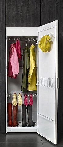Внутри шкафа расположено несколько уровней складных телескопических вешалок, на которых можно как развешивать плечики, так и размещать обувь. Их общая длина составляет 16 м. На дверце находятся специальные держатели для шапок, перчаток и прочих мелких предметов. При необходимости дверцу можно перевесить, расположив сушильный шкаф в удобном для вас месте. Обратите внимание, что он требует обязательного подключения к вентиляционной системе.